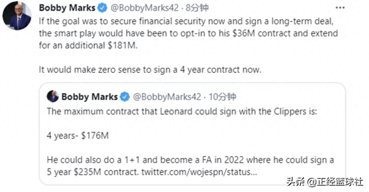 但即便如此,快船队依然非常希望能够留下伦纳德,据薪资专家Bobby Marks报道,伦纳德可以和快船直接签下一份4年1.76亿美元的大合同,考虑到伦纳德已经30岁,这也很可能是他职业生涯最后一份大合同。