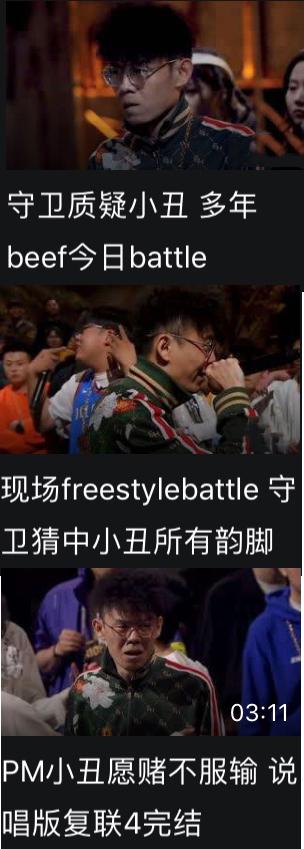 小丑对战守卫,但是他俩有意思的是出来battle不是由导师选择的,而是自己跳出来的。看起来两人之间是早有Beef,后面守卫说出早在2017年他俩就比过freestyle,而且守卫赢了。所以小丑是一直想要赢过守卫的,而真正来讲小丑的词大部分都是背的,也就是说原创很少。但是在单人作品battle上小丑展示的作品是略胜一筹的,主要是小丑的心态很不好,感觉他就是个矛盾体,一会儿很自信,一会儿又很丧,太玻璃心了。讲真,大家都是成年人了,但是这么不知进退我还是头一回看到,完全不尊重导师。