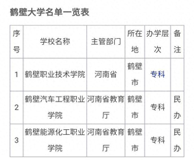 河南省鹤壁市是1986年成为地级市的,所以高等教育的发展比较落后,目前的3所专科高校分别是鹤壁职业技术学院,鹤壁汽车工程职业学院,鹤壁能源化工职业学院。这其中鹤壁职业技术学院是鹤壁市唯一的公办专科院校,也是鹤壁市实力最强的高校。