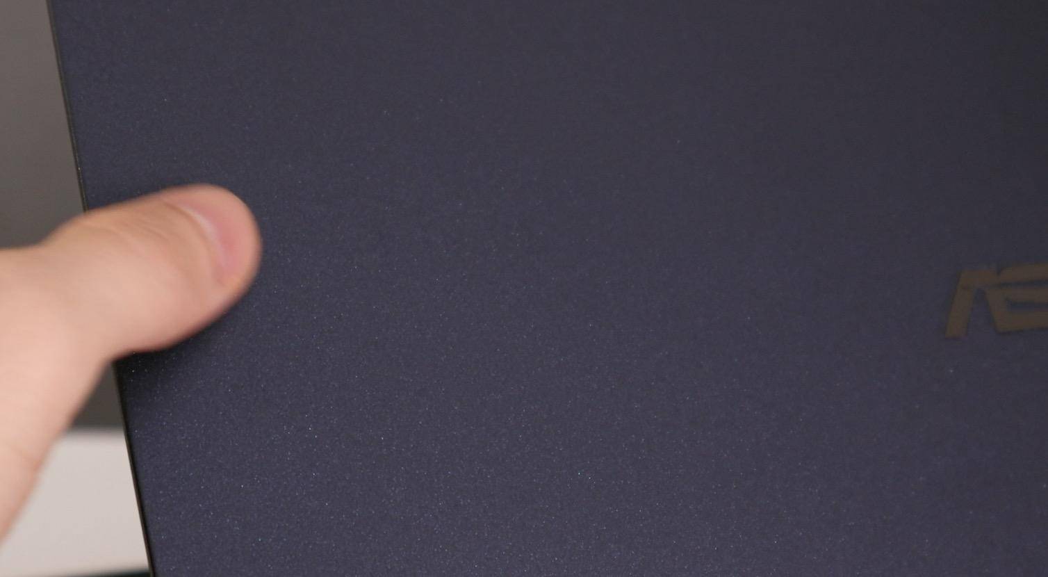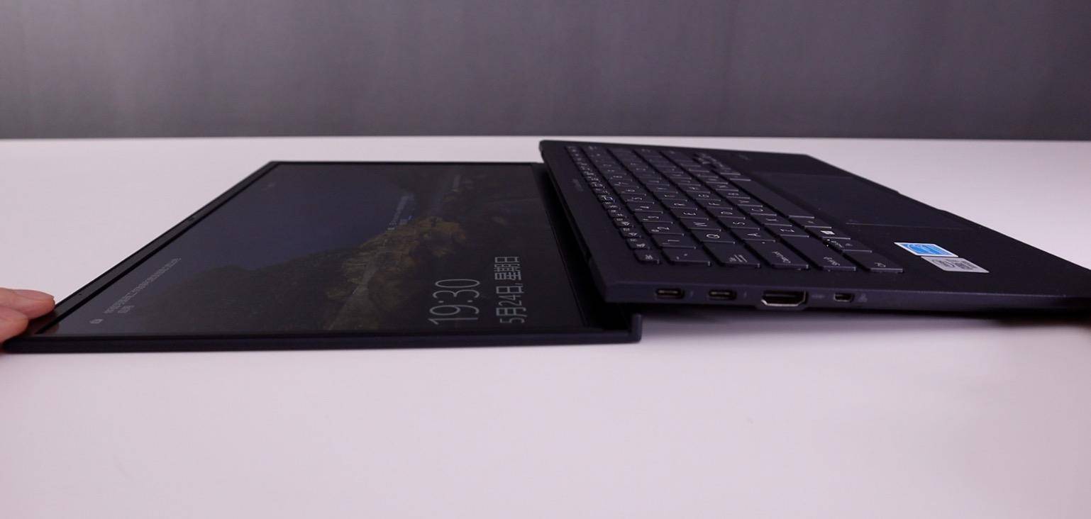 打开屏幕B面是1080P的雾面屏,这种特别轻的笔记本通常都是雾面的,因为覆盖一层玻璃还是会增加不少重量的,顶部的摄像头可以物理遮挡,对于商务人士很有用。转轴是华硕的一个经典设计,可以把笔记本架起一个角度。