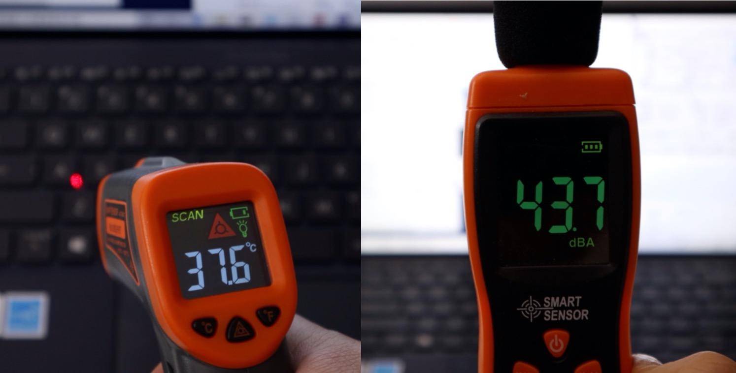 噪音方面略大,贴近键盘的区域在56分贝,而人脸位置大约在44分贝左右。