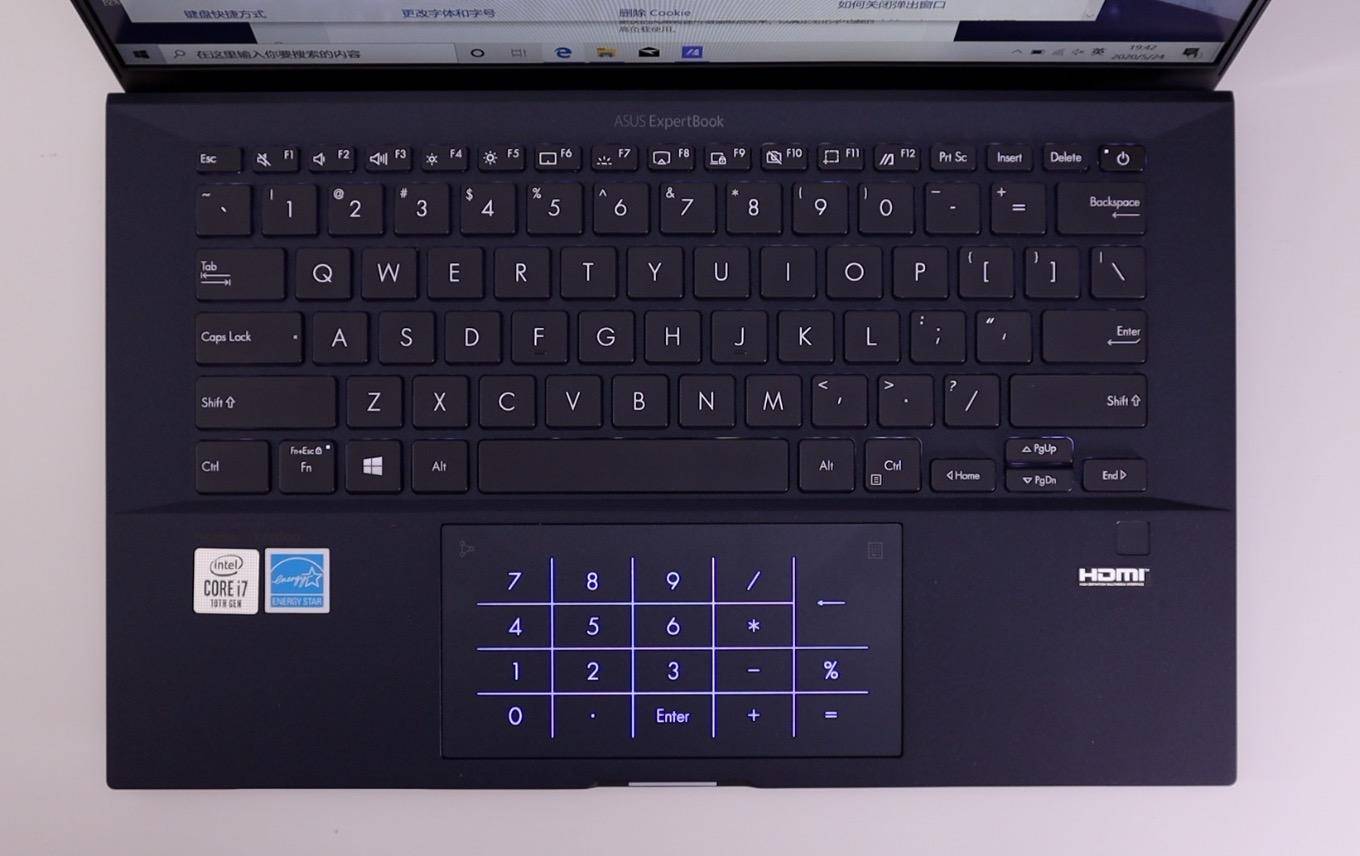C面键盘的键程还是比较长的,手感不错,方向键是缩小版的,指纹识别并没有和开关键集成在一起,而是放在键盘的右下方。值得说的是这个触摸板,面积很大,玻璃材质,触感很顺滑,按一下右上角,可以唤出数字小键盘,当然,由于是在敲平面,肯定不如实体的小键盘手感好,不过14寸的本肯定不可能有实体小键盘,总比没有强,左上角可以调节亮度,也可以滑动在屏幕上直接打开计算器,不过我觉得都打开计算器了应该也直接把小键盘电量似乎更合理一些,然而并没有。另外我发现这个唤出小键盘的操作,快速点击是不行的,需要稍微多呆一点点时间。