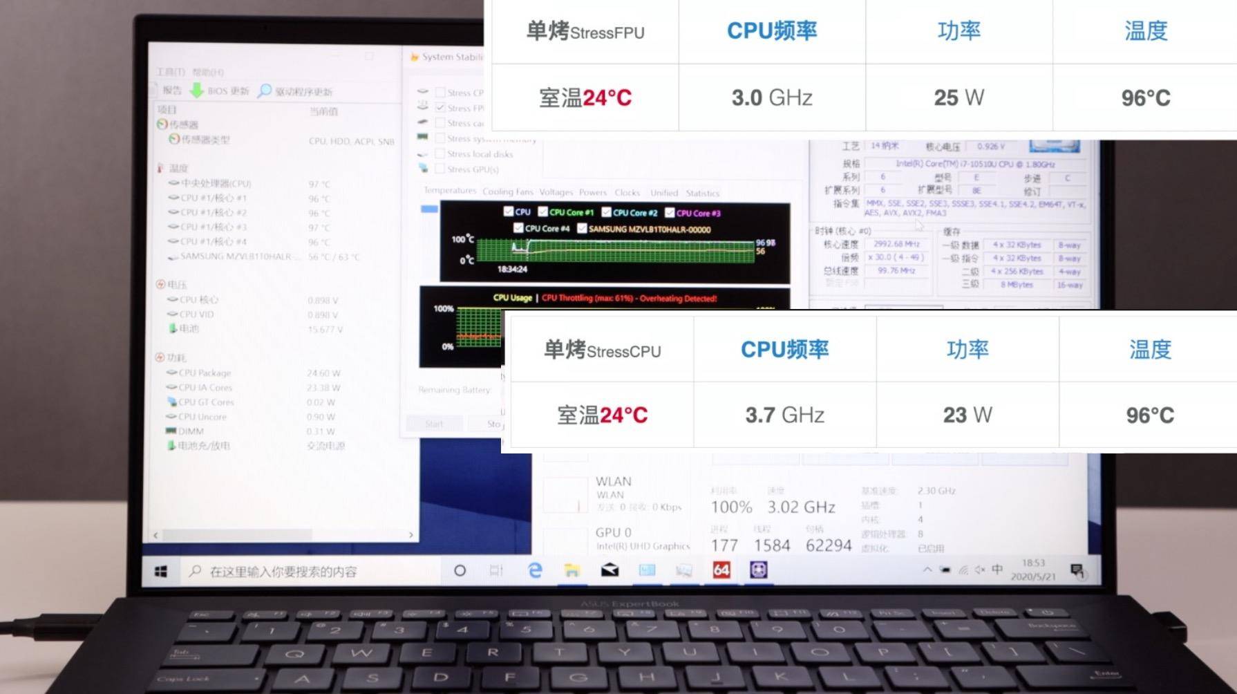 烤机测试方面,在室温24度的环境下,单烤FPU,可以稳定在25W,CPU频率3.0GHz,温度97度,而切换到Stress CPU,则是可以稳定在23W,频率则是增加到了3.7GHz。