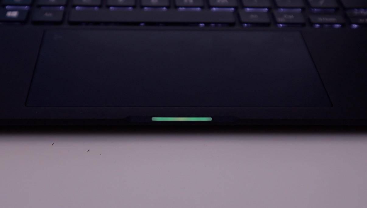 最下方有一个指示灯,绿色代表电量是满的,红色代表电量不满,而蓝色代表开启性能模式。