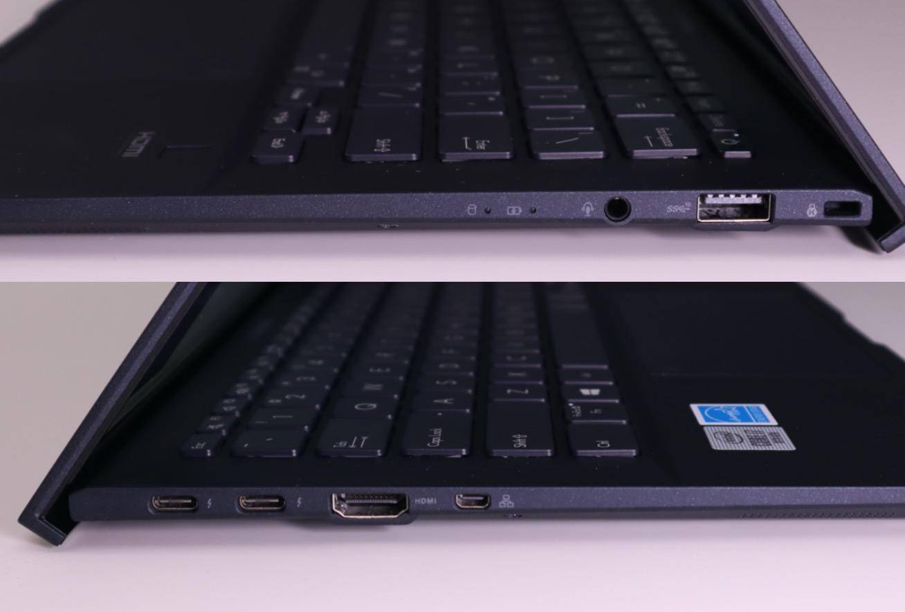 接口方面,右侧是一个耳麦接口和一个A口USB,gen2的速度。左侧则是2个雷电3接口,一个HDMI接口,还有这个是mini网线接口,华硕还随机附赠了一个转普通RJ45的转接头。这些接口的扩展性上来看,也是在全方位的为商务人士考虑啊。
