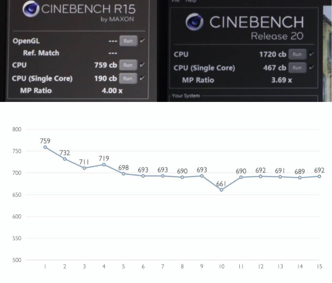 还是跑个分,Cinebench R15,759分,单核190分,连续15轮跑分成绩如图,基本上可以保持在690分左右。R20,1720分,单核467分。