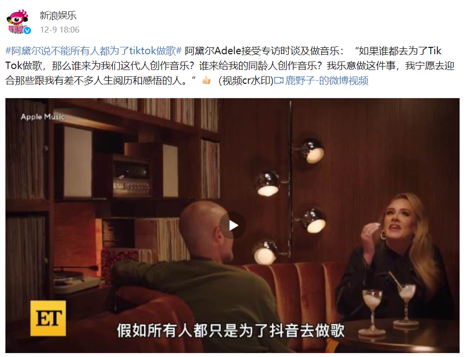 近期,英国天后Adele在专访时提到:“如果谁都去为了Tik Tok做歌,那么谁来为我们这代人创作音乐?谁来给我的同龄人创作音乐?我乐意做这件事,我宁愿去迎合那些跟我有差不多人生阅历和感悟的人。”
