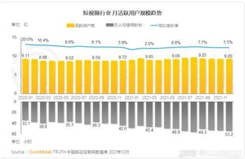 QuestMobile公布数据显示,短视频行业活跃用户量增速出现放缓,而用户时长却呈现加速增长态势。