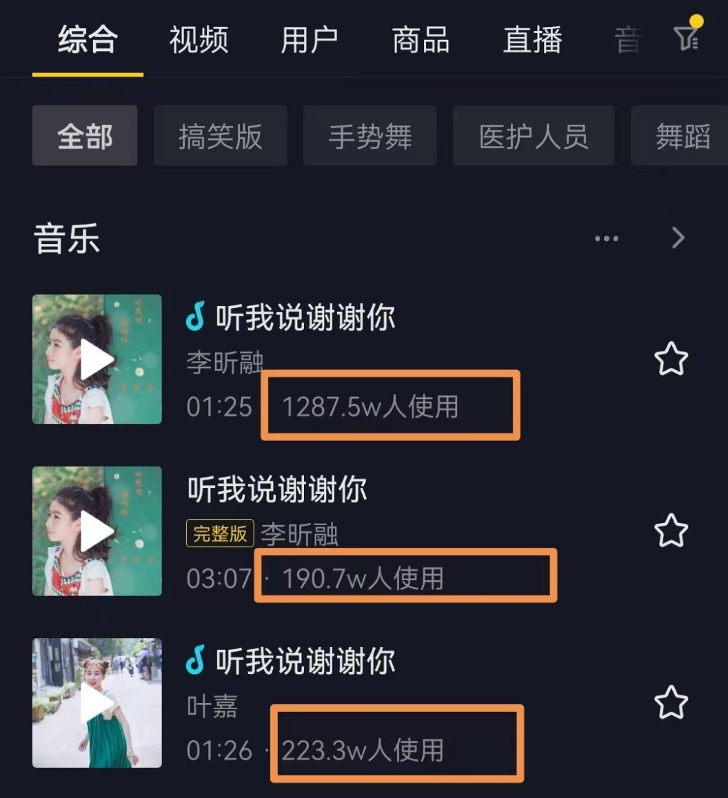 歌曲《听我说谢谢你》在抖音被使用的次数