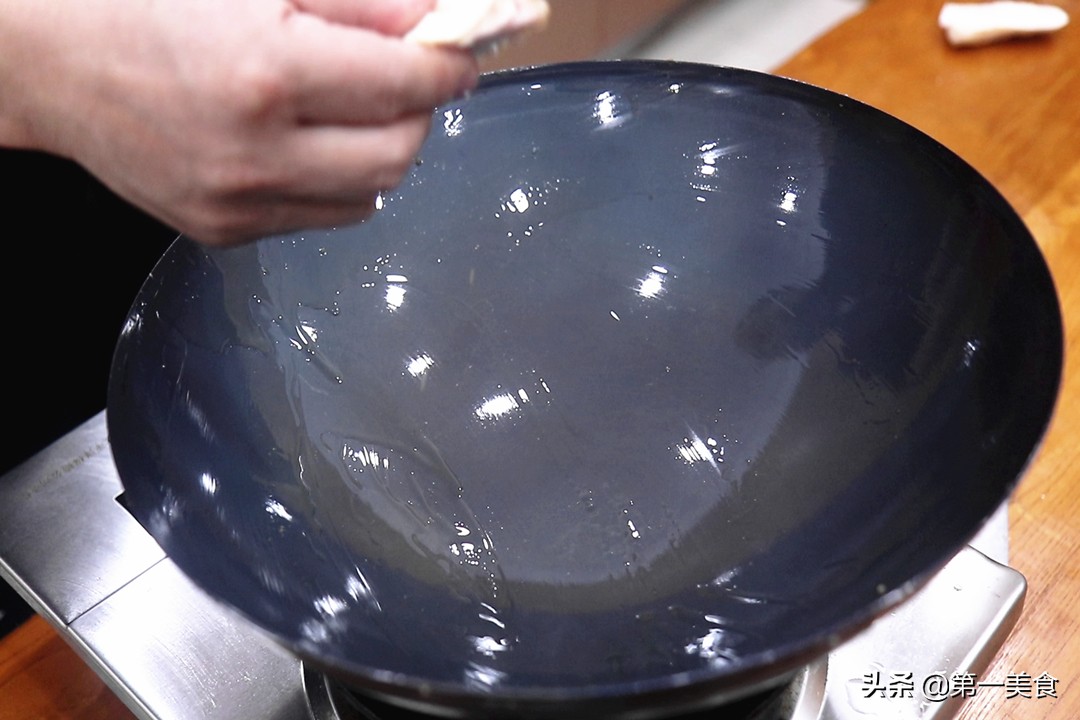 再一次把锅加热,拿出一块肥油,在热锅上不断的擦拭,锅的温度不要太高,肥肉擦在上面,流油就可以了。这一步就像车洗好以后,我们进行的打蜡、镀晶。