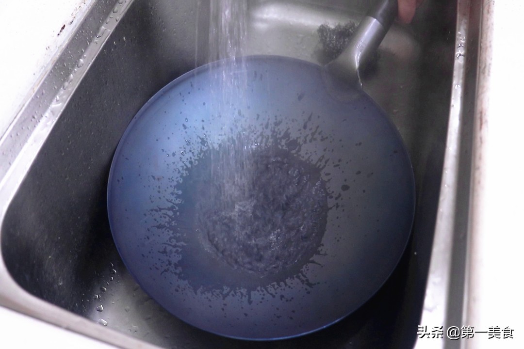 烧好以后,我们把锅放在一边、自然冷却一下,千万不要立即浇水,因为快速降温容易引起铁锅变形,破坏铁锅光滑的表层。当温度下降到100度以下,我们再用洗洁精清洗一下,这一步已经清洗掉了表面的工业油和杂质。