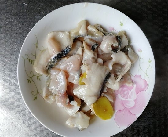 1、黑鱼的鱼刺比较少,处理干净内脏清洗好以后,顺着主刺片成薄薄的鱼片。鱼片片好以后,放进碗里,加几片生姜、一勺食盐、食用油、适量淀粉和清水,用手抓匀后腌制十分钟左右。淀粉和水的比例为1:2,加水淀粉可以让鱼肉更加嫩滑,加食用油可以防止鱼片下锅时粘锅。