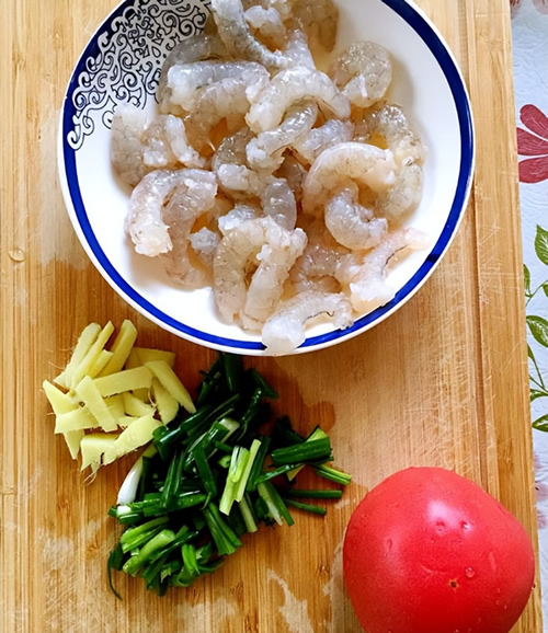 1、新鲜大虾剪掉虾头,剥掉虾壳,从虾背处挑出虾线,冲洗干净沥干水分后放进碗里。加料酒、食盐和淀粉,用手抓匀后腌制十五分钟。番茄洗干净后放进碗里,用开水冲烫一下更好去皮。去皮后的番茄切成小块。