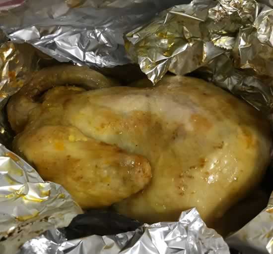 2、腌好的鸡用吸油纸吸掉表面的水分,取出肚子里的姜片、葱段和花椒,换上新的姜片和葱段。然后在鸡身上均匀地刷上一层食用油,用锡纸把鸡包裹起来。