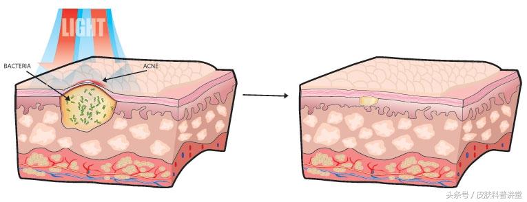 1. 痤疮丙酸杆菌在自身代谢过程中产生原卟啉IX与粪卟啉,卟啉吸收蓝光后产生单态氧和自由基,迅速杀死痤疮丙酸杆菌,同时抑制皮脂腺细胞分泌油脂、降低炎症反应。