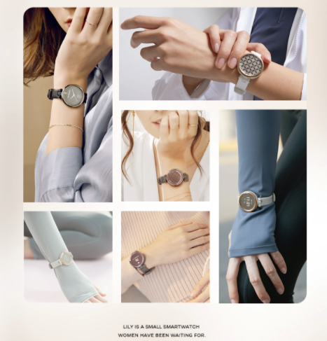 这款GarminLily给人一种纤薄、轻盈又精致直观感受。它的表盘直径仅有34.5毫米,而表盘的厚度仅有10.15毫米,整个表身的重量也只有24克,几乎是市面上“最小巧”的智能手表了。对比之下Apple Watch SE表盘都达到了40毫米,厚度10.7毫米,重量更是达到了30克。普通的智能手表不点亮的时候,大多都是「黑屏」状态,毫无美感可言。而Garmin Lily 采用了印花表盘+隐藏式屏幕设计,赋予了智能手表更时尚的风格表达。