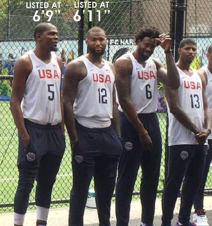 美国队集训的时候,考辛斯告诉杜兰特别站在他旁边。考辛斯的注册身高为2.11米(6尺11寸),杜兰特的注册身高为2.06米(6尺9寸)。但两人看上去身高差不多。
