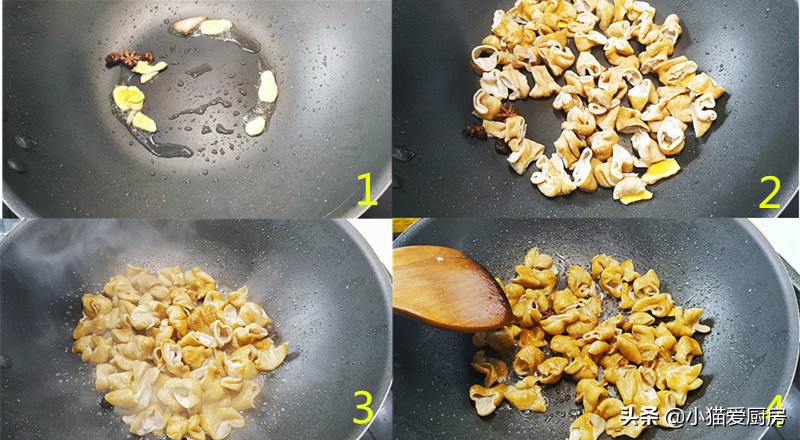【步骤五】:取一个炒锅,烧热后放入一勺油约10克,放入大料、陈皮、生姜小火炒香,然后把肥肠放里边,小火慢慢炒,把肥肠的水汽炒干。