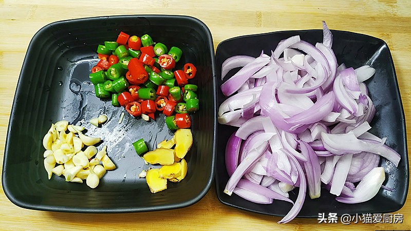 【步骤三】:把剥去外皮洋葱切成丝,生姜切成片,把大蒜切成粒、青红尖椒切成圈备用。