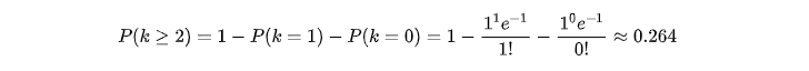 最后,我们看一道书上的例题,实际感受一下泊松分布的应用。假设我们有一批零件,它的次品率是0.1%,也就是千分之一。请问我们生产一千个产品当中至少有两件次品的概率?