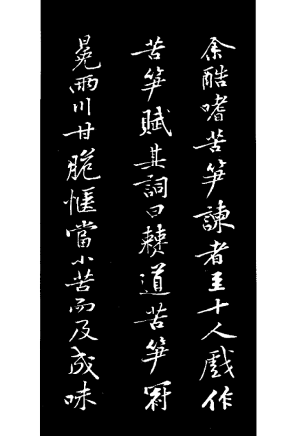 《苦笋帖》通篇"用笔婉丽,出规入矩,未有越于法度外畴"(明代项元汴跋语)。点画粗细浓淡,结字大小正斜,线条柔中寓刚,神采飞动。挥写时的动作犹清晰可按,如"茗"字,草头逆势起笔,取险成势,"茗"字下部偏旁"名"字果敢铺毫,尤其"口"字写为两个点,神完气足,可闻金石之声。作品于不经意中,体现了书家深厚的功力。寥寥十四字,在钩连拗铁、简洁捷速和惊绝的笔画中,给人感受到的不仅是跳动流淌的旋律、非凡的气势,还译读到了书家知茶、爱茗之情,又需要茶(《苦笋帖》亦被称为怀素"乞茶帖")。书伴茶香,怡然自得。可谓"香茶苦笋异常佳,帖中感惠留佳话。"