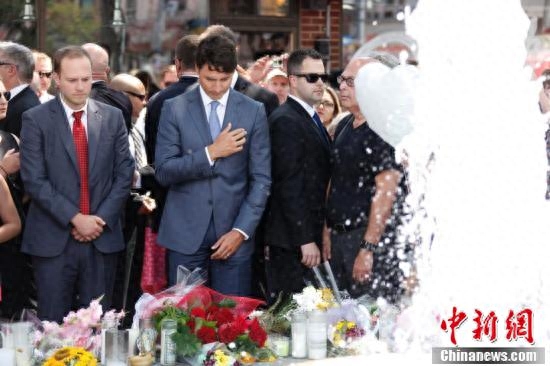 当地时间7月30日,加拿大总理贾斯廷·特鲁多在多伦多参加“7·22”恶性枪击案遇难者葬礼,并到案发地希腊城街区献花悼念遇难者。