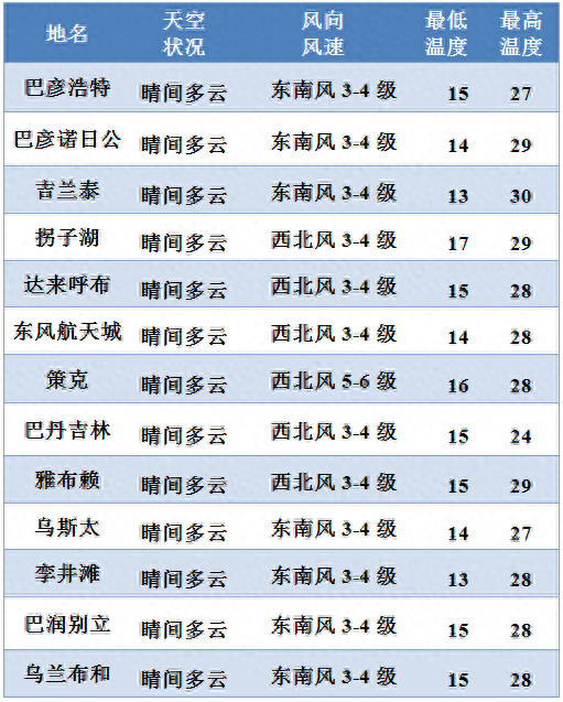 10月1日:晴间多云,额济纳旗西部西北风5-6级,额济纳旗东部、阿右旗大部西北风3-4级,其余地区东南风3-4级。